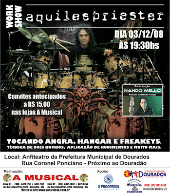 Para um fã de mitologia, quando dizem o nome Aquiles, imediatamente lembram do guerreiro que foi atingido no calcanhar, mas para um fã de Heavy Metal, quando dizem o nome Aquiles, imediatamente se lembram do Aquiles Priester, renomado baterista que toca na banda Angra (ao menos por enquanto) e na banda Hangar e tocou no projeto paralelo de Fabio Laguna (tecladista do Angra) intitulado Freakeys. Aquiles Priester esteve em Dourados no dia 03/12/2008, realizando um workshow no anfiteatro da Prefeitura Municipal, mostrando seu trabalho com seu equipamento completo junto ao baixista Nando Mello (que toca com ele na banda Hangar) tocando músicas das bandas citadas. Aquiles trouxe seu grande drumkit o qual demonstrou ser digno de ter um, demonstrou muita simpatia aos fãs, também respondeu perguntas e passou sua experiência aos 300 espectadores (aproximadamente). Contou também um pouco de sua biografia, entre outras histórias sempre bem humoradas. O “Polvo” como também é chamado devido a um apelido e que já faz parte de sua logomarca, mostrou o material do qual é endorsee e utiliza. Explicou o funcionamento e também suas técnicas usadas. Aquiles também mostrou entrosamento e bom humor com sua equipe, a qual tinha que ouvir seus apelidos “carinhosos” criados por Aquiles. Acredita-se que a única coisa que quem foi assistir ao workshow pode reclamar foi a pequena quantidade de brindes e merchandising oficiais sorteados e pelo fato de não poder fazer gravações do grande baterista tocando. Excluindo isso, o pessoal aparentava estar muito satisfeito de poder ouvir e ver algumas das músicas preferidas das bandas relacionadas a esse grande baterista como “Nova Era” do Angra, “The Reason Of Your Conviction” e “Call Me In The Name Of Death” do Hangar, e no final do workshow ainda poder conversar um pouquinho com ele, tirar foto e receber autógrafos. Quanto ao merchandising, alguns produtos da banda eram vendidos no local, o que é muito importante para ajudar os músicos, mas também é importante para os fãs de Dourados e região que estavam presente, pelo motivo que a maioria das cidades da região não possui rockstore. Sempre brincalhão e piadista Aquiles demonstrou a que veio e teve uma grande performance em palco, também ensinou quem perguntou e falou da importância de ser baterista, da dedicação e do estudo que é necessário para chegar onde ele chegou. Ele fez uma brincadeira depois de tocar a música “Symbolic” da banda Death que deixou algumas pessoas confusas, quando contou uma história (até convincente) de que o vocalista e guitarrista da banda Death (Chuck Schuldiner) falava “Cebola grátis com limão” em vez de “Symbolic acts so vivid”, Aquiles disse que muitos ainda não acreditam nessa história. Esse workshow foi importante (obviamente) pra quem aprecia o trabalho dele, mas também, para mostrar que Dourados está crescendo musicalmente e que pode crescer mais ainda, essas iniciativas são fundamentais para a cena de Rock and Roll e Heavy metal de Dourados. Quem não foi deve lamentar-se, porque nessa cidade não se encontram iniciativas e eventos dessa magnitude todos os dias, infelizmente.